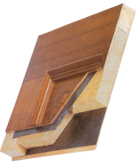 - Interior compuesto por aglomerado y enmarcado por cerco de pino, dos chapas de acero de 0'4 mm, tablero contrachapado de Sapelly-Pino o Roble. Otras maderas previa consulta. Molduras macizas de madera.